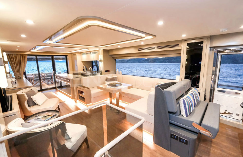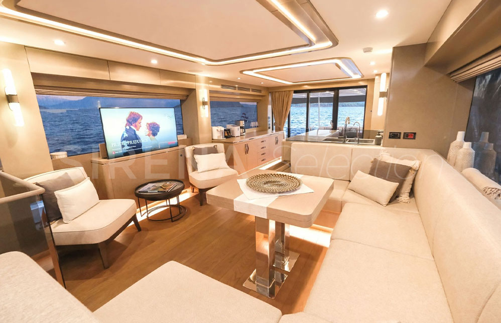 • Saloon Layout I Galley on the port side at the entrance of the saloon. Furniture unit opposite the galley. U sitting group and a foldable fixed dining table on the port side in the middle of the saloon. Sofa with a space behind for the optional hi-lo tv, opposite the U sitting group